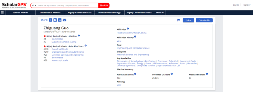 据统计,内地共有285位学者进入终身榜单,1596位学者入选近五年榜单。按ScholarGPS提供的榜单显示,郭志光教授荣登近五年榜(Highly Ranked Scholar - Prior 5 Years)第438名。