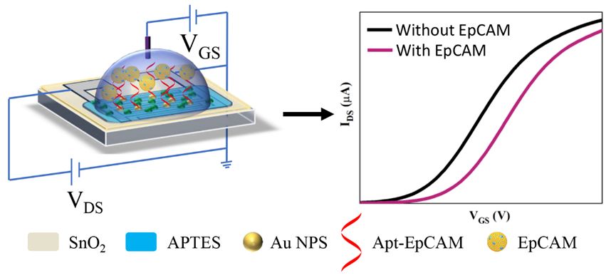 EpCAM是重要肿瘤标志物,其高表达与癌症早期诊断和治疗密切相关,但现有检测方法存在标记步骤复杂、稳定性差、灵敏度低等问题。无标签检测技术无需复杂标记步骤,可简化操作、提升效率,因此开发无标签、高灵敏度EpCAM检测方法对癌症早期诊断和治疗意义重大。团队在传感器领域权威期刊ACS Sensors一区top期刊IF:8.3)上以“Solution-Gated Thin Film Transistor Biosensor Based SnO2Amorphous Film for Label-free Detection of Epithelial Cell Adhesion Molecules”为题,报道了关于无标记高灵敏检测癌症重要标记物上皮细胞黏附分子的最新成果。常钢教授湖北大学健康科学与工程学院何汉平教授为论文共同通讯作者,湖北大学为第一作者单位。