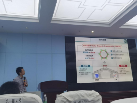 宁国宏教授介绍了金属有机框架(MOFs)和共价有机框架(COFs)的区别,并阐述了其作为两类高晶性、易修饰的多孔材料,在气体吸附、储能、传感、催化以及药物缓释等多个领域的广泛应用。MOF化学(配位化学)与COF化学(共价键化学)近年进行交叉融合,产生了一种新型共价金属有机框架(CMOFs)。宁教授自加入暨南大学李丹教授团队以来,利用环三核团簇作为构建单元,设计合成了一系列的环三核团簇基CMOF材料。该类晶态多孔材料赋予了金属团簇以多孔特性,展现出优于团簇构筑单元的普适性、稳定性、光催化反应活性、吸附性能等。宁教授就“如何可控合成,构筑性能优异的CMOF”这一问题,和大家分享了自己的学术研究思路。提问环节中,宁教授热情回答了师生的提问。