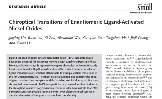 近期,曹万强教授团队有关配体诱导氧化镍纳米材料的手性的论文“Chiroptical Transitions of Enantiomeric Ligand-Activated Nickel Oxides”正式在材料领域权威期刊——Small上在线发表。湖北大学是该论文的第一署名和通讯单位。材料学院硕士生林家颖是论文第一作者,李以文副教授和程佳吉副教授是论文通讯作者。