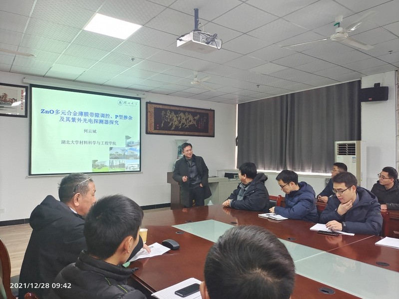 2021年12月28日,应湖北师范大学先进材料研究院的邀请,何云斌教授到访该学校。交流访问期间,何云斌教授作了题为“ZnO多元合金薄膜带隙调控、P型掺杂及其紫外光电探测器探究”的学术报告。该院先进材料研究院、物电学院部分教师、研究生聆听了报告。报告会上何云斌教授细致全面地介绍了他们课题组多年来在ZnO材料方面的研究成果,通过制备ZnO的多元合金薄膜实现了对ZnO带隙的调控、并且实现了稳定的P型掺杂,这些成果为ZnO材料在新型紫外光电探测方面的应用奠定了基础。报告结束后,何云斌教授与在场师生就相关问题进行了深入的讨论。