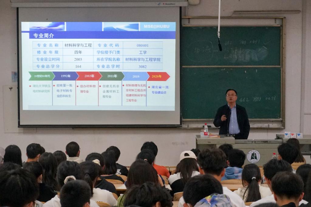 “湖北大学的人才培养总目标,就是培养具有深刻的人文底蕴,扎实的课本知识,宽广的国际视野,强烈的创新意识和社会责任感的,能够在区域经济和社会发展中发挥引领和示范作用的人才。”章天金围绕专业简介、人才培养目标、课程体系及师资力量四个方面向学生们介绍光电材料知识。最后,他推荐学生们把“知识、能力和素养”三个方面作为参考选择课程,并希望学有余力的学生们积极融入到老师们的课题组。