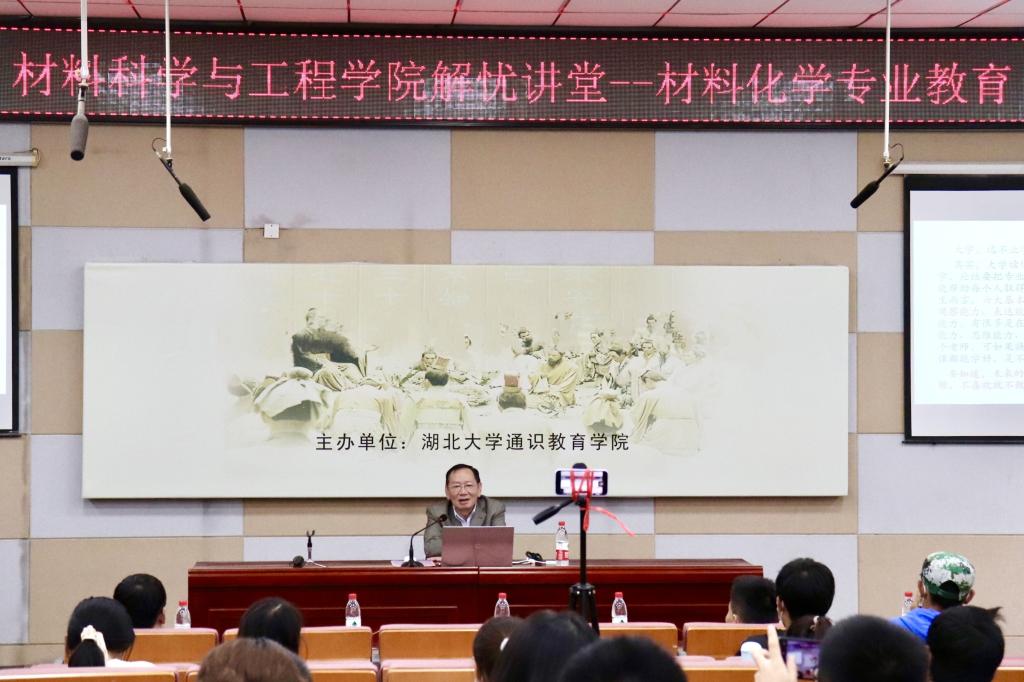 王世敏以“我们的大学 我们的专业”为题与学生开展交流。王世敏表示,材料学是人类社会发展三大支柱——能源、信息、材料的基础,影响着国家前沿科技的研发与运用,也深刻关系到国家发展的前途与命运。他向同学们详细介绍了我校材料化学专业的学科背景、成就以及该专业自身的沿革与发展