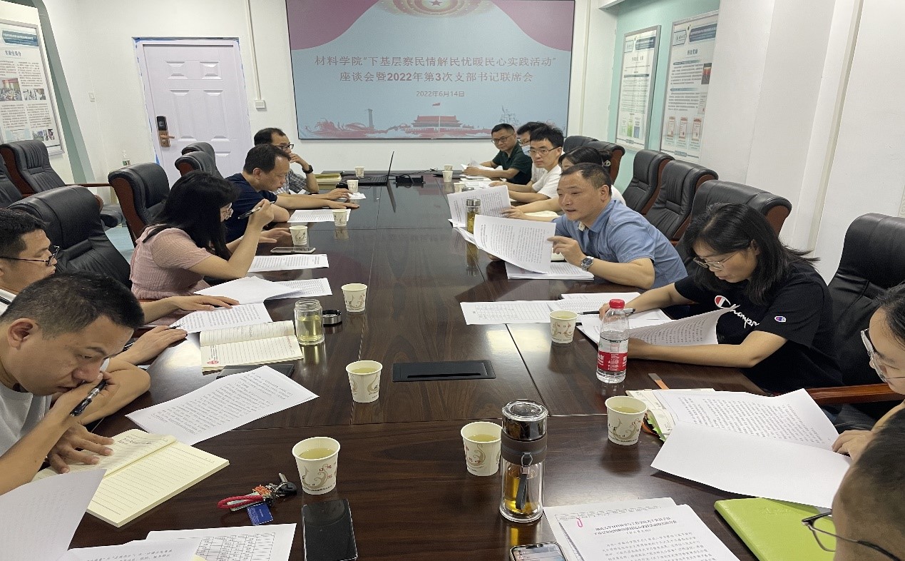 6月14日上午,材料科学与工程学院在二楼小会议,召开“下基层察民情解民忧暖民心实践活动”座谈会暨第3次党支部书记联席会。院党委书记宋韧、副书记鲁力格格和各党支部书记参加会议。