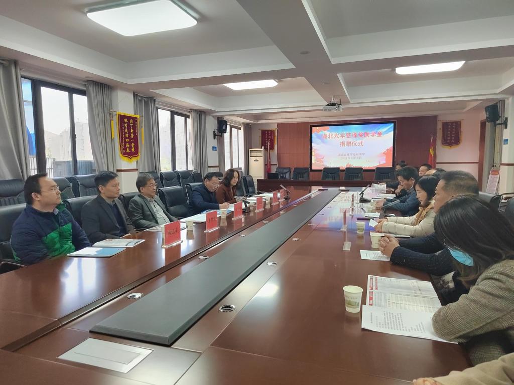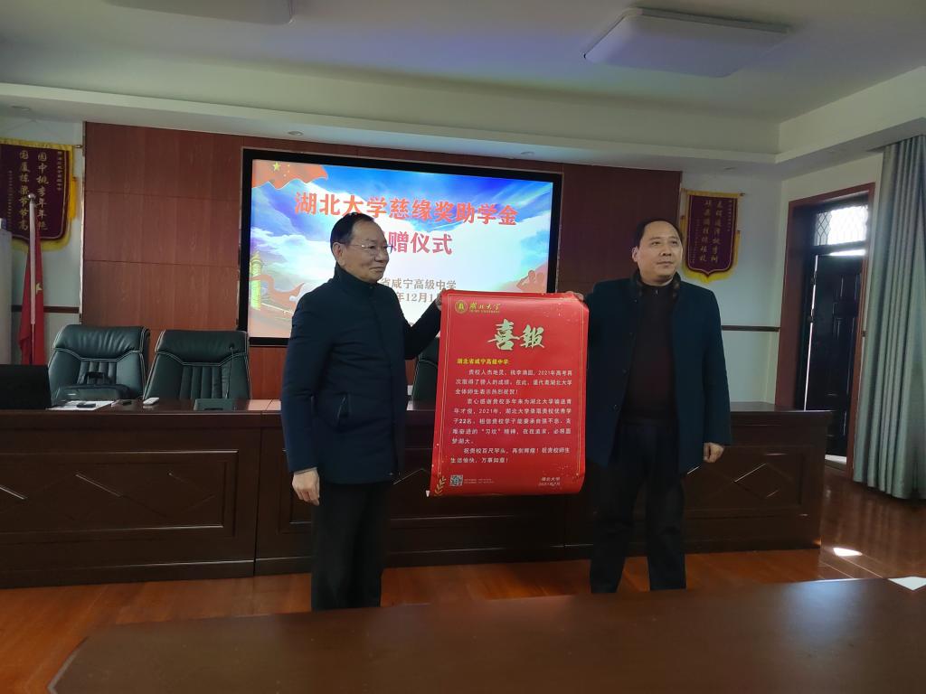 上午,咸宁高级中学慈缘奖(助)学金颁发仪式如期举行,咸宁高级中学校长朱大浩、副校长黄继阳、副校长陈蕾、资助中心主任吴军、学工主任杨新兵以及班主任代表、湖北大学校友代表参加了仪式。慈缘奖学金发起人叶正涛教授为十名受助学生颁发奖助学金,激励学生自信自强,努力成长成才。王世敏校长为咸宁高中送去喜报,感谢咸宁高中作为优质生源基地为我校输送了大批优秀的学子。仪式后,湖北大学一行还同咸宁高中湖大校友进行了亲切交流。
