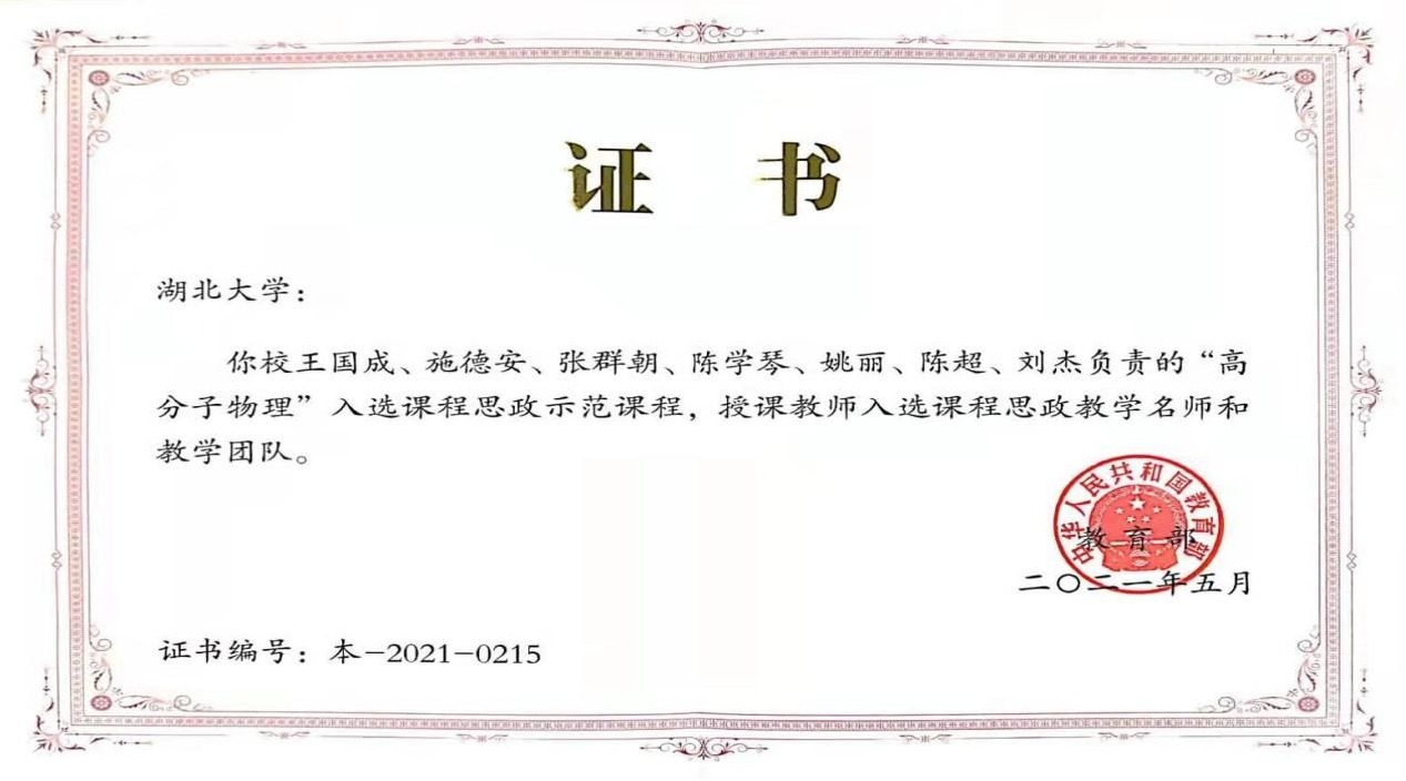 近日,教育部公布2021年课程思政示范项目名单,我院王国成、施德安、张朝群、陈雪琴、姚丽、陈超、刘杰等教师负责的高分子物理”教育课程获评教育部“课程思政示范课程”,七位授课老师均入选课程思政教学名师和教学团队。