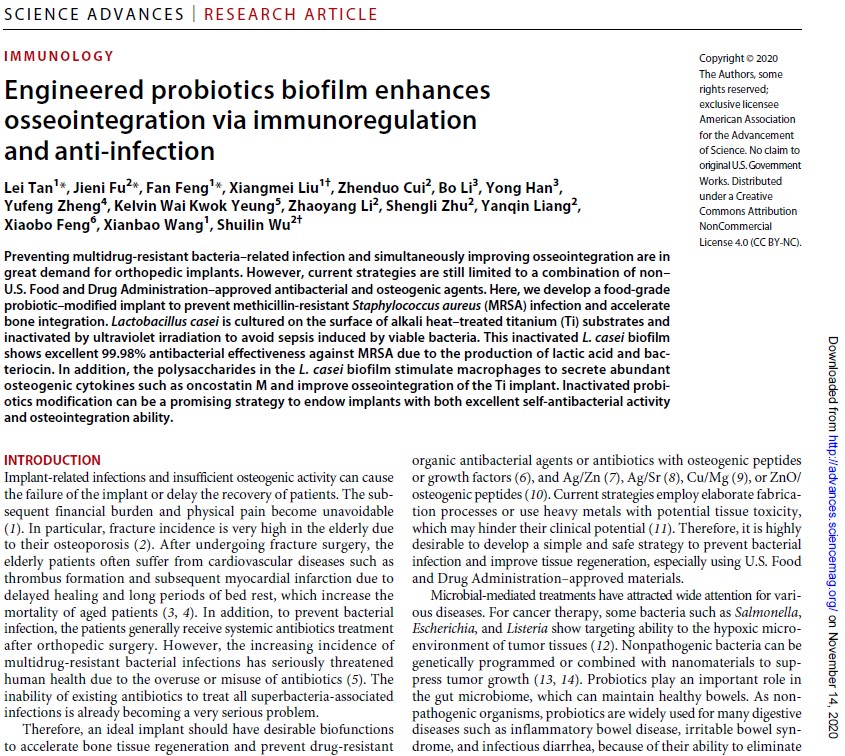 该团队利用食品级灭活的干酪乳酸杆菌生物膜在钛植入体表面构建了功能性涂层,生物膜中的乳酸和细菌素在体内和体外对耐甲氧西林的金黄色葡萄球菌(MRSA)表现了优异的抗菌性能。同时通过对相关蛋白和基因分析,证实了干酪乳酸杆菌生物膜可以有效激活巨噬细胞的免疫响应,分泌的成骨细胞因子成功促进了骨髓间充质干细胞的成骨分化并加速了骨整合。这种益生菌修饰的骨植入体,由于不会将活菌引入血液,将是一种安全的生物功能材料。这项研究表明益生菌不仅可以治疗肠道疾病,而且在其他疾病的免疫治疗中也有着潜在的应用。
