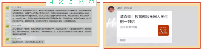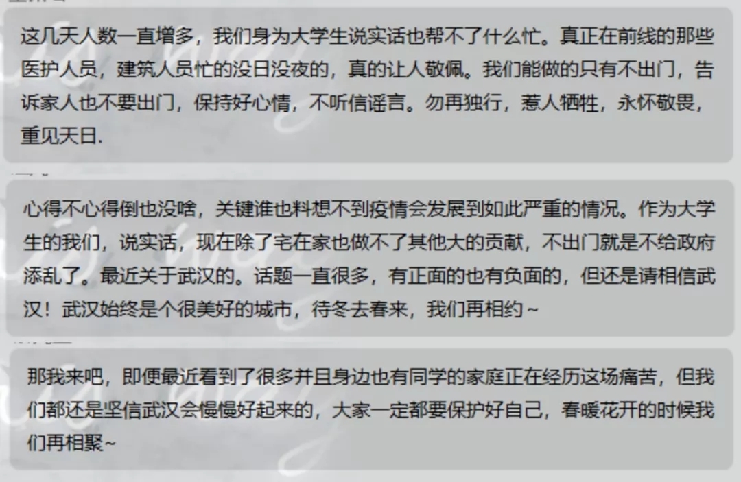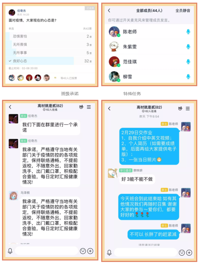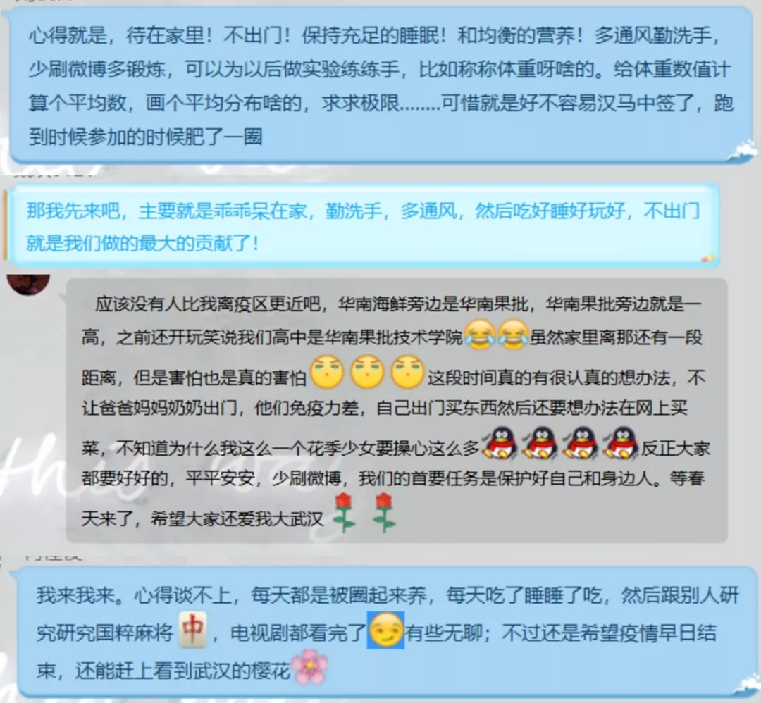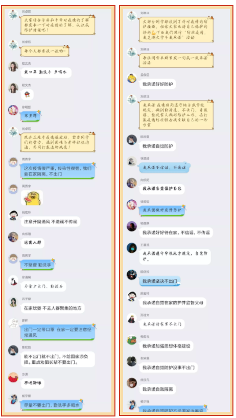 2020年2月6日 20:002018级高材1802班于2020年2月6日晚在班级群内举行本次线上班会。班主任李岚老师及全班同学参与组织了本次特色活动,首先班内同学根据有关疫情的学习资料发表对此次疫情的认识、了解、防护措施等。“防控疫情,我是湖大学子我承诺”活动中,同学们又一人一句表达了自己的心声。班长简要总结后,通知其他注意事项。