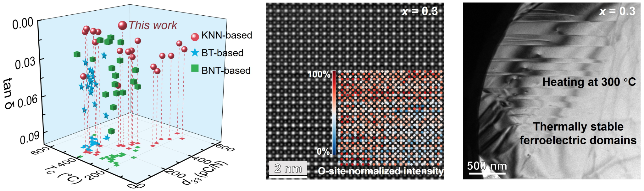 压电陶瓷广泛应用于传感、驱动及能量转换等领域。(K,Na)NbO3(KNN)基无铅压电陶瓷兼具较高居里温度和良好压电性能,但仍存在介电损耗偏高及热稳定性不足等关键问题。针对该问题,研究团队通过系统调控载流子迁移行为与铁电畴动力学,实现材料多性能协同优化。在材料基体中掺杂适量CuO形成氧空位,构建的缺陷偶极子在畴壁附近产生显著钉扎效应,有效抑制极化翻转及畴壁运动,从而降低介电损耗。同时,CuO作为烧结助剂促进材料致密化,进一步抑制电导损耗。运用原位透射电镜发现在KNN基无铅压电陶瓷中形成了多级铁电畴构型,其中有序铁电畴与高密度畴壁协同作用,使其在较高温度范围内保持结构稳定,从而显著提高材料的退极化温度。研究结果表明,在0.3 mol% CuO掺杂条件下,所制备的KNN基无铅压电陶瓷实现了超低介电损耗(tan δ~0.3%)、优异压电性能(d33~264 pC/N)以及高退极化温度(Td~285 °C),并在20–285 °C范围内表现出良好的热稳定性。此外,该材料还展现出优异的抗热老化性能和时间稳定性,在高温及长时间工作条件下仍能保持较高的压电响应。