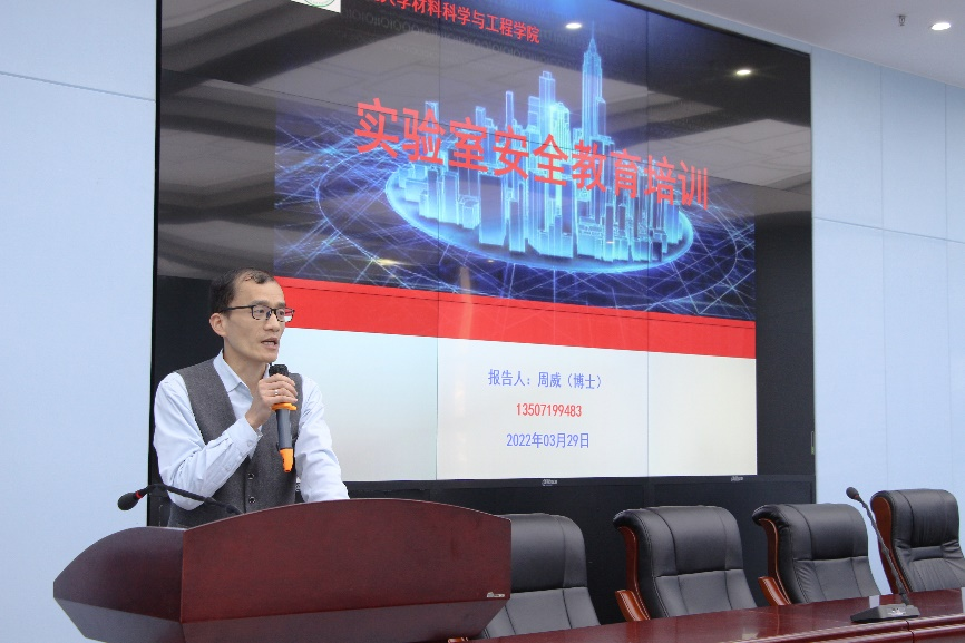 为进一步加强学院实验室安全管理,材料科学与工程学院于2022年3月29日上午在2001报告厅开展研究生实验安全教育培训,党委副书记鲁力格格发表讲话,周威老师做实验室安全教育报告。