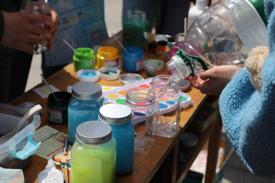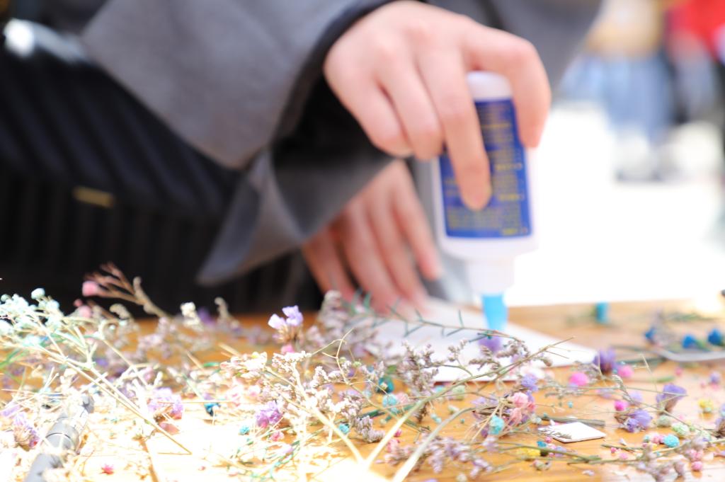 太阳渐渐变得火辣,同学们被摊位前色彩斑斓的干花和五彩缤纷的颜料吸引了眼球。他们纷纷驻足,听完志愿者的讲解后跃跃欲试,都想要发挥自己的创造力制作出独一无二的作品。现场气氛十分火热,志愿者们也十分热情,以实际行动践行着“无私奉献、助人为乐、不畏艰苦”的雷锋精神。